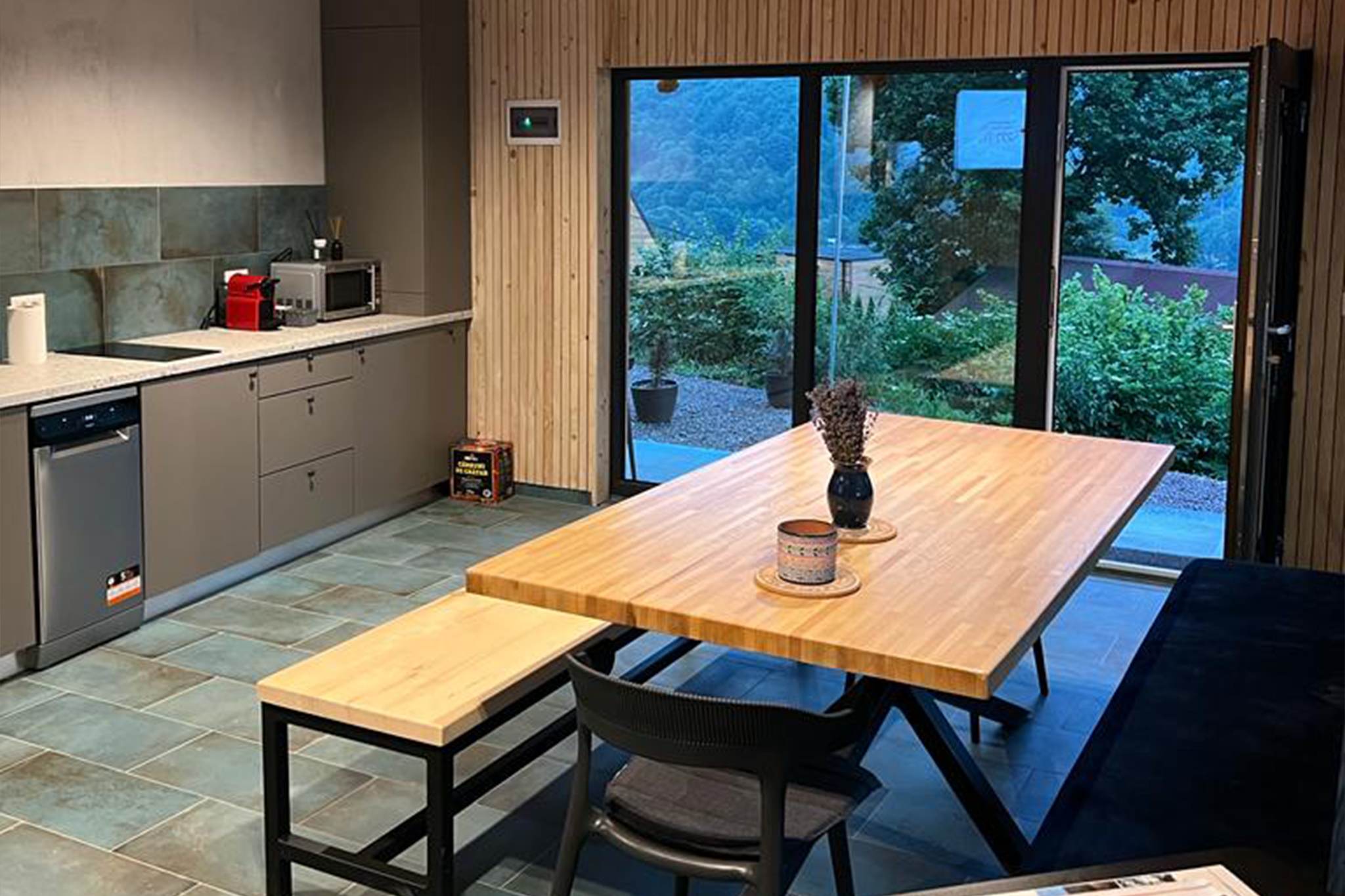 Totodată oaspeții noștri au acces la o terasa comună, închisă, de 35 m2, cu bucătărie complet utilată, ce poate fi folosită atât iarna cât și vara. Aceasta dispune și de un grup sanitar propriu.